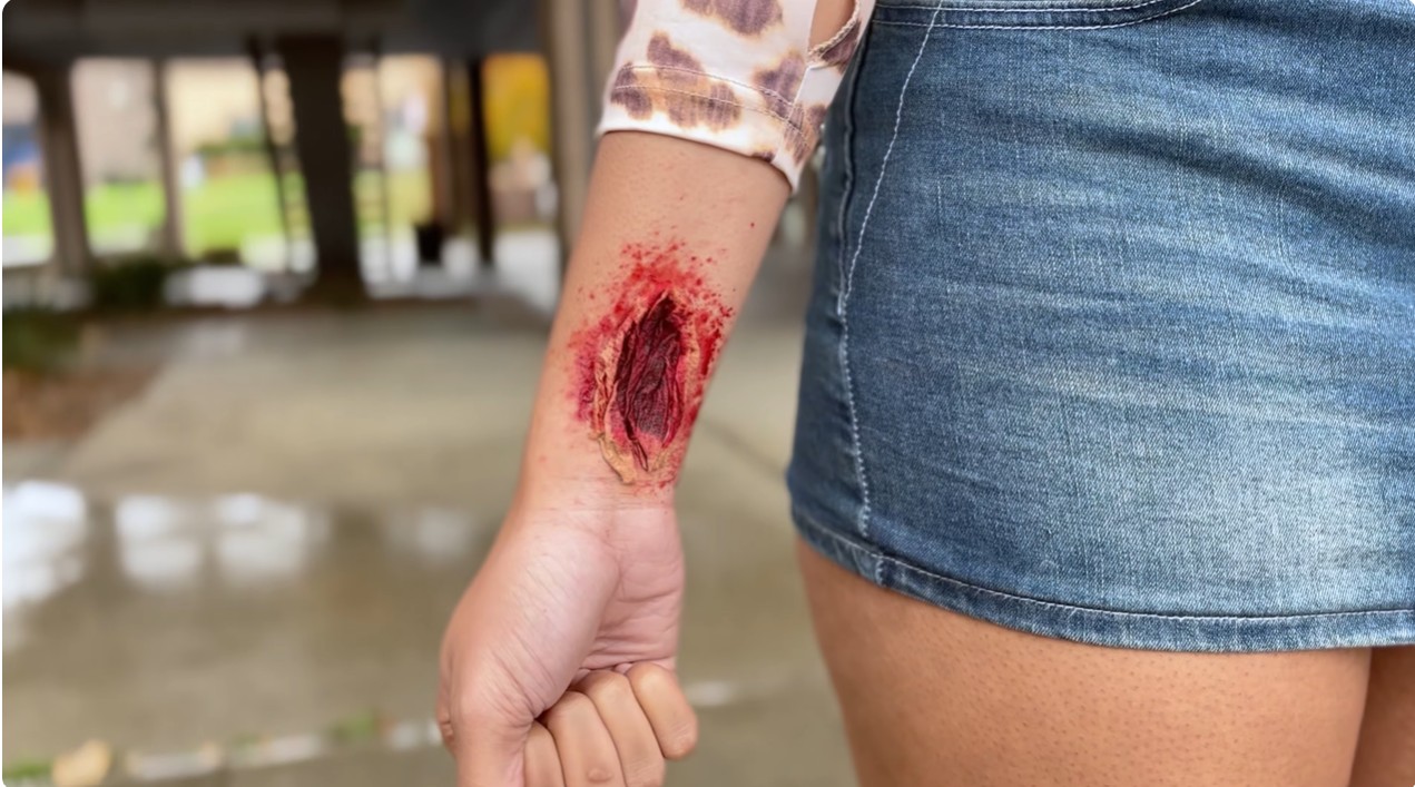 Bring every costume decision to bring stereotypes to life to make the film easier to follow. For Practical Effects I used items in everyday item such as napkin, tacky glue foundation and fake blood to make the effect as realistic as possible to bring that sense self-inflicted wound.